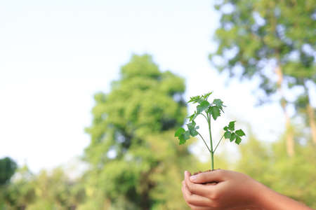 Farmer hand holding a fresh young plant. Growing new life and environmental conservation, homegrown organic vegetables