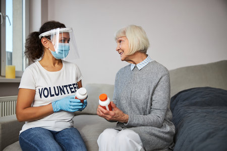 Social worker wearing a face shield and mask speaking with an elderly lady while keeping a medicine bottle