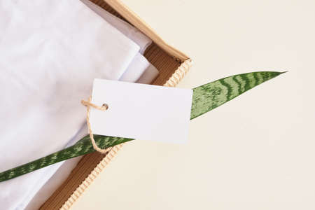 empty white tag and underwear, t-shirt in a cardboard box on a brown background, green leaves as a symbol of naturalness, natural materials, eco clothing