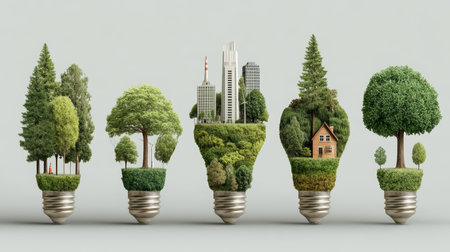 A creative scene with a lightbulb filled with trees and cityscape, symbolizing sustainable living and harmony.