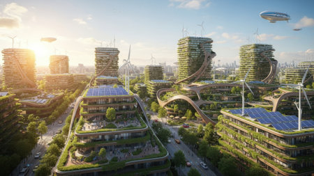 Eco friendly urban landscape featuring sustainable architecture and renewable energy solutions