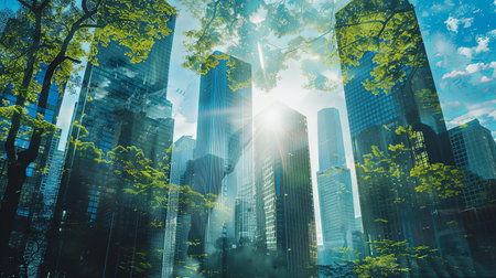 skyscrapers in the bustling business district, with lush greenery interspersed throughout, symbolizing sustainable development and urban environmental consciousness.