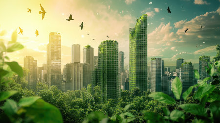 An illustration presents a futuristic city, showcasing green buildings and sustainable energy sources. The composition features vibrant green foliage contrasting with modern architecture. The image suggests concepts of environmental responsibility, potentially suitable for visual content in educational or promotional materials, emphasizing eco-friendly practices and urban development.