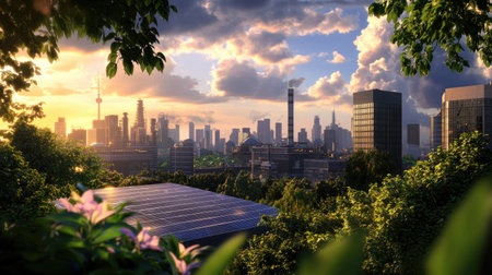 A captivating urban landscape featuring solar panels amidst vibrant greenery, showcasing a stunning city skyline at sunset, emphasizing sustainability and innovation.