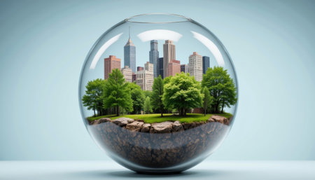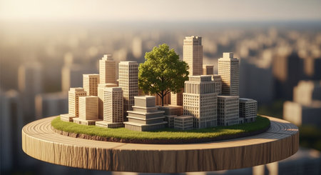 Miniature cityscape featuring skyscrapers and greenery, symbolizing urban sustainability and nature