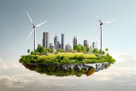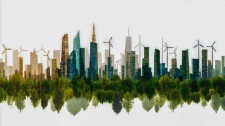 Urban skyline with wind turbines and greenery showcasing sustainable development concept