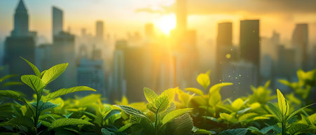 Leaves showing vibrant green leaves with water droplets in front of tall city skyscrapers at sunset. resolution use. Clear details and vibrant colors enhance visual appeal. leaves, green, vibrant.