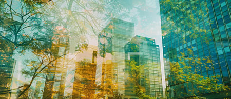 This captivating urban landscape showcases the blend of modern architecture and lush greenery, featuring glass buildings reflecting nature. The scene highlights the harmony between urban life and the environment, demonstrating the importance of integrating green spaces in city design.