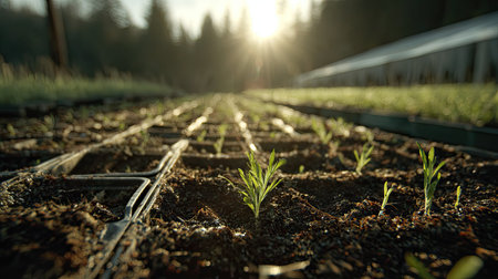 Small plants sprout from dark soil arranged in rows. The composition focuses on the seedlings with a shallow depth of field. Warm sunlight bathes the scene, creating highlights and shadows. The overall style suggests a natural, organic aesthetic, suitable for visuals related to environmental themes or agricultural projects.
