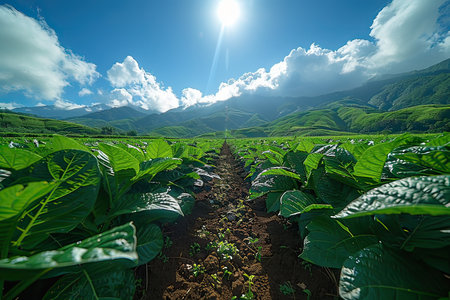 This stunning image captures a vibrant green crop field adorned with neat rows under a bright blue sky, framed by majestic mountains in the distance.