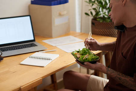 Young man sitting at desk in home office, eating chicken salad and talking on phone with coworker