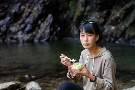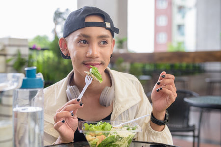 Nonbinary Asian person eating healthy caesar salad outdoors