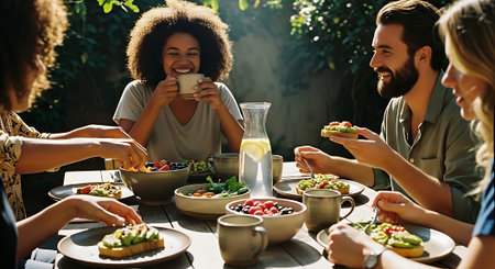 A group of friends sharing a meal outdoors, with smiles and laughter. The table is filled with fresh salads, toast, and beverages.