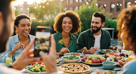A joyful group of friends sharing a meal outdoors, with various fresh foods, drinks, and someone taking a photo.