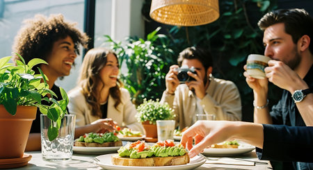 A group of friends enjoying brunch at a restaurant, featuring avocado toast with poached eggs in the foreground, laughter and conversation, warm sunlight