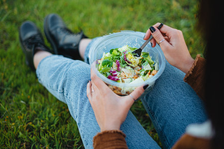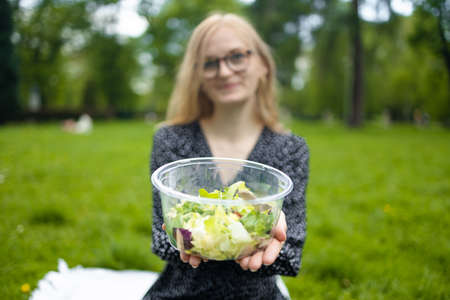 Cropped view of young woman with a charming smile eats a salad of fresh vegetables while walking around the city park during lunch break.
