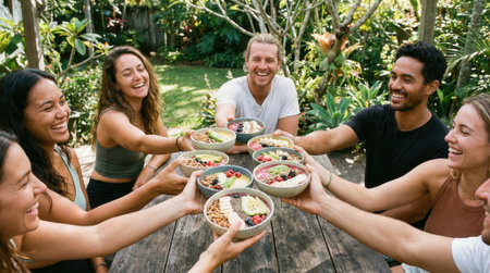 A multiethnic group of happy friends at a wooden table outdoors, laughing and cheering with nutritious fruit smoothie bowls. A scene of community, wellness, and healthy lifestyle.
