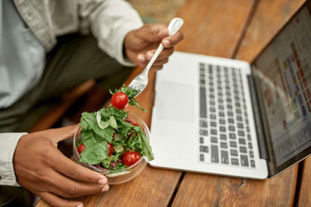Hand of woman eating healthy food salad vegetables with fork for lunch.