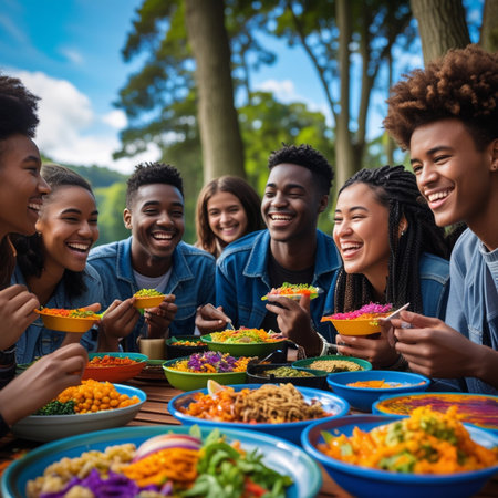 Enjoying a vibrant meal with friends at a rustic table on a sunny day during lunch time