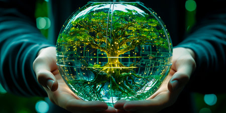 Tree growing on crystal globe. Digital Convergence and and Technology Convergence. Blue light, binary and network background. Green Computing, Green Technology, Green IT, csr, and IT ethics Concept.