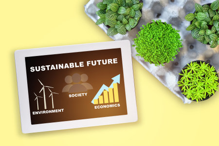 Sustainable future environment protection society and economics on computer tablet with planting a few trees. Energy living concept and save the earth idea