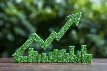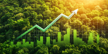 An upward arrow symbolizes the growing trend in sustainable investment, representing green finances and environmental practices.