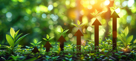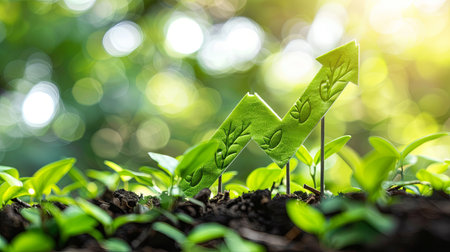 This conceptual image depicts the relationship between nature and business growth, featuring plants and an upward arrow on soil, symbolizing prosperity and success.