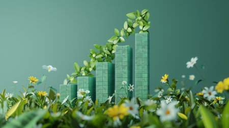 This image showcases a creative representation of growth with a green bar graph and fresh leaves, symbolizing financial prosperity and sustainability within nature.