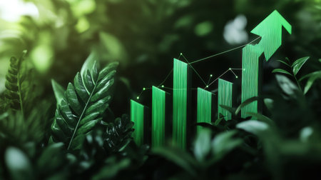 A bar chart representing growth with fresh green leaves on a green background, showing the concept of sustainable finance and eco-friendly investment.