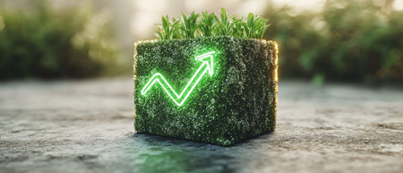 This composition showcases a cube covered in lush grass, featuring a glowing upward arrow, symbolizing growth and sustainability in a serene outdoor environment.