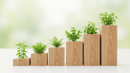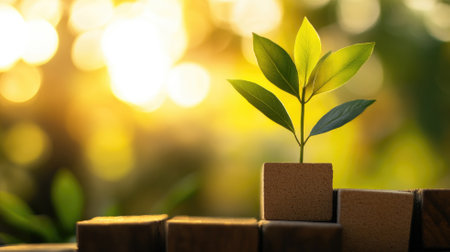 The image features small green plants placed on wooden blocks arranged in ascending order, symbolizing growth. The natural lighting and soft focus in the background, which adds to a sense of tranquility, highlights the plants' growth. This arrangement can be used in various commercial projects to illustrate concepts of progress.