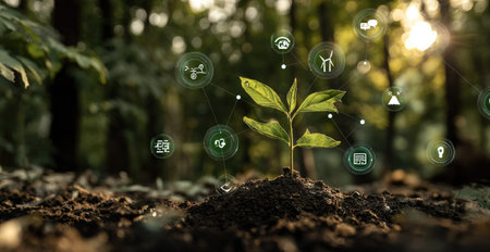 A vibrant green seedling sprouts from dark soil, set against a blurred background of green foliage. Surrounding the plant are digital icons suggesting growth, sustainability, and development. The image employs soft lighting and a shallow depth of field, offering visual appeal for various commercial applications.