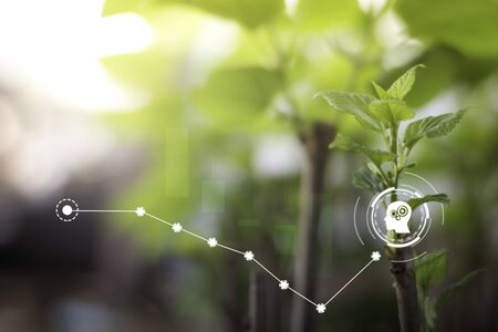 Hand plant a tree growing step and arrow graph business of growth and success in future. Business growth, development, profit and success.