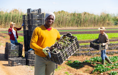 Harvest time. Group of farm workers cutting fresh young leaves of red lettuce on farm field