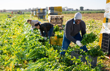 Three farmers working on vegetable plantation; putting freshly harvested celery in boxes