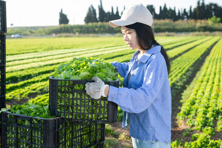 Smiling asian girl farmer holding box with harvested green lettuce on field