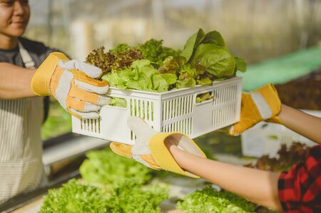 Organic farming, salad farm. Farmers harvest salad vegetables into wooden boxes in rainy. Hydroponics vegetable grow naturally. greenhouse garden, Ecological Biological, Healthy, Vegetarian, ecology