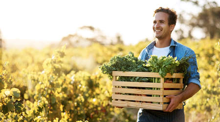The bounty of my efforts. Shot of a young man holding a crate full of freshly picked produce on a farm.
