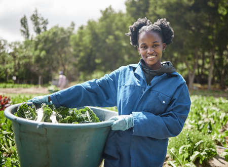 Afro female farmer working in farmland harvesting fresh vegetables - Farm people lifestyle concept