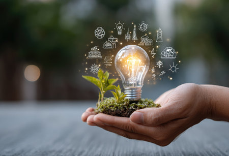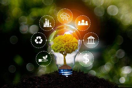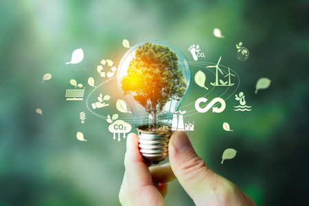 A creative representation of sustainable energy featuring a tree growing inside a light bulb, symbolizing eco-friendly technology and green energy solutions.