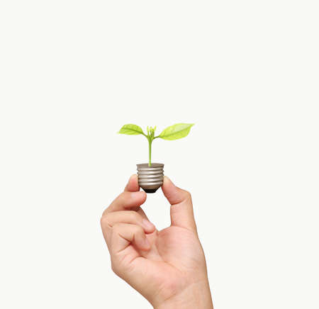 The hand that emerged from the ground, including a small tree growing in an energy-saving light bulb, an energy saving and environmental protection concept.