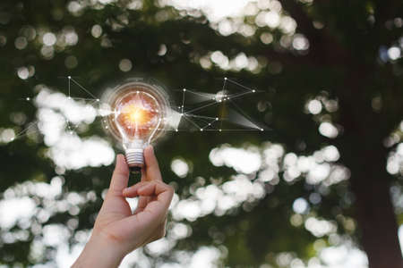 Hand holding Light bulb with light flare blur bokeh nature background. eco innovation environmental and idea creative concepts.