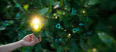 Green energy innovation light bulb with future industry of power generation icon graphic interface. Concept of sustainability development by alternative sources renewable. Ecology and environment.