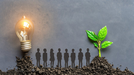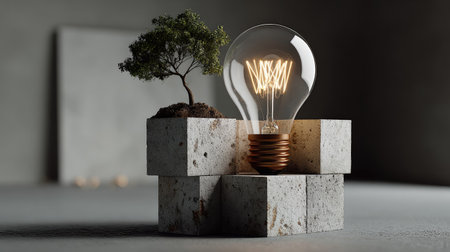 This artwork features a bright light bulb paired with a small tree on textured concrete blocks, symbolizing innovation and harmony with nature.