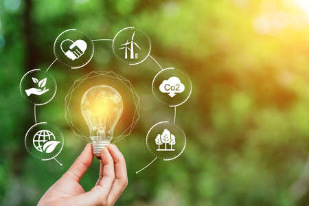 Concept save energy efficiency. Hand holding light bulb with icon on blurred tree background
