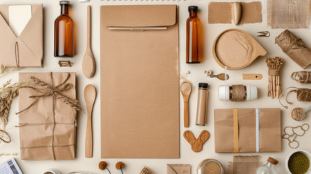 Flat lay of natural and eco-friendly packaging materials with plants and tools. Earthy tones, minimalist, top view for branding and product presentation concept.