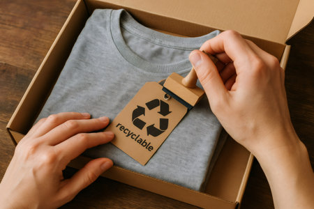Hands stamping a recyclable logo onto a label of an eco friendly t shirt nestled inside a cardboard box, emphasizing sustainable packaging