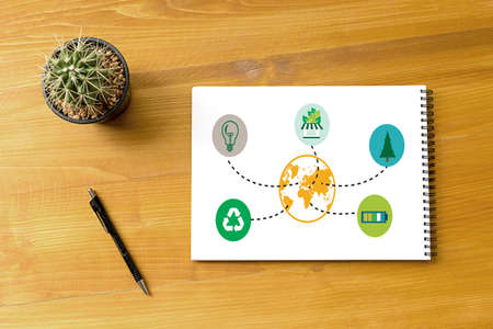 climate change and solutions to global warming conceptual still-life, To Do list to save the environment and green branch with lush leaves growing around it