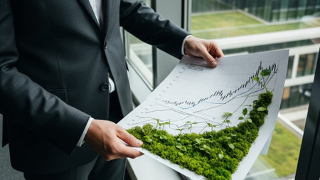Businessman planning on environmental protection initiative for clean and sustainable future ecology, ESG environmental social governance display on paper chart on eco-friendly company..