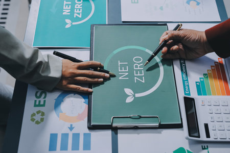 Carbon offset price report CO2 emission. Future growth Net zero waste in ESG ethical SME office protect climate change global warming social issues project. Group of asia people Eco friendly SDGs plan